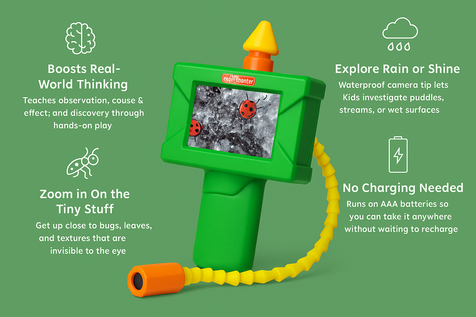 Give your child the freedom to explore, investigate, and learn—without screens. The Snake Scope’s flexible camera lets kids look inside holes, under rocks, and even underwater. It's simple to use, totally portable, and built to survive real outdoor play. Whether in the backyard or at the park, they’ll stay curious and entertained for hours.